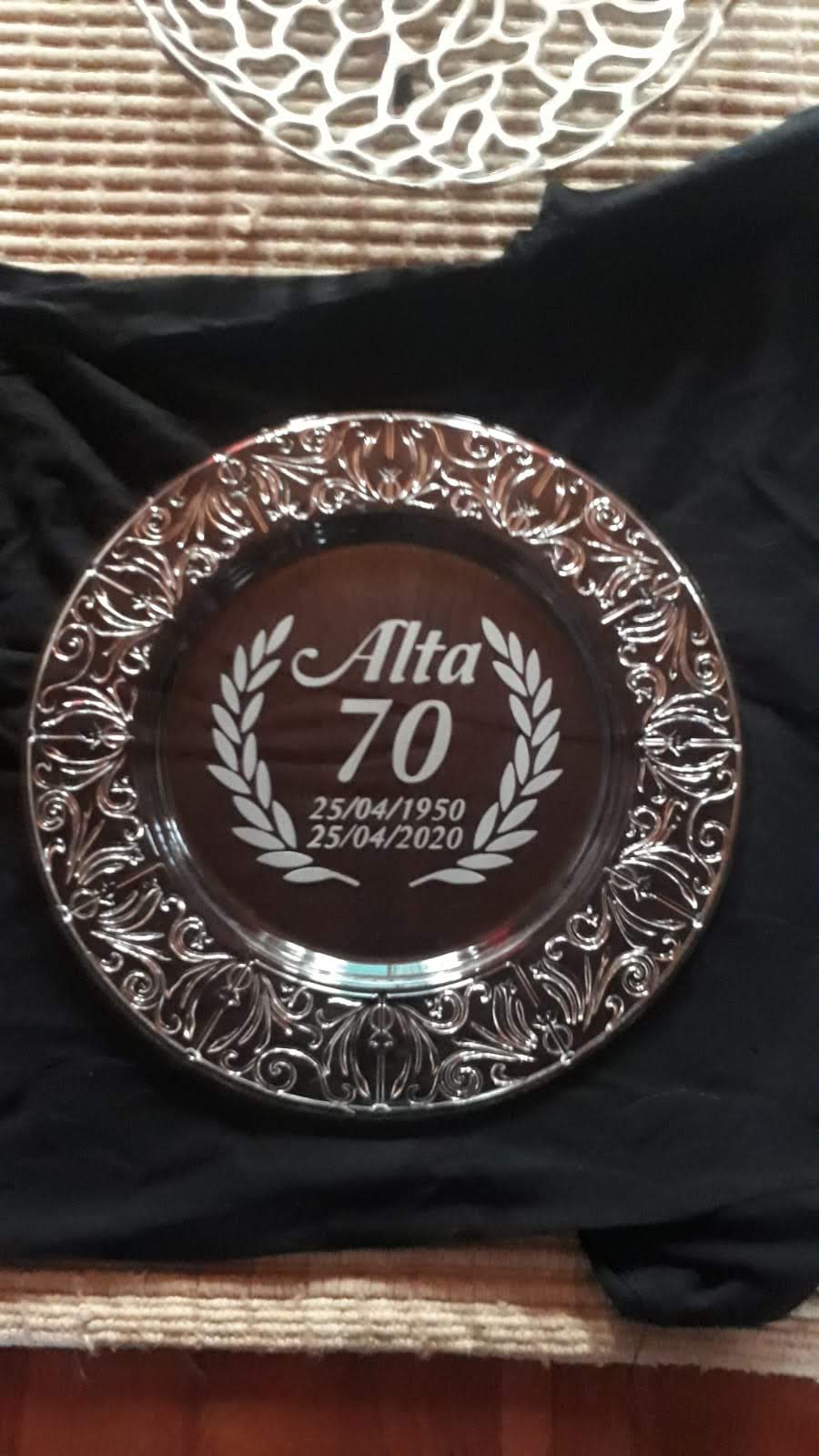 The sandblasting is done in revers so the front part stays flat. The plate can be hanged on a wall or stand up straight on a stand